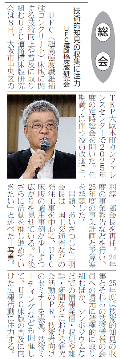 UFC道路橋床版の設計、製作、施工及び維持管理に関わる技術の向上ならびに普及を通じて社会貢献することを目的として、設立総会をもってUFC道路橋床版研究会が設立されました。
